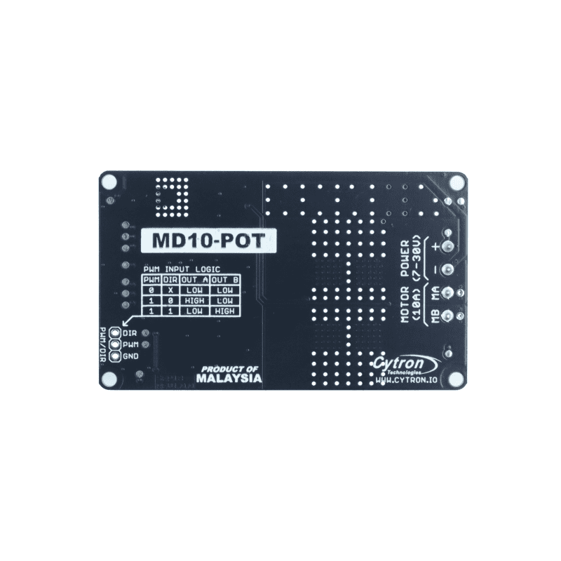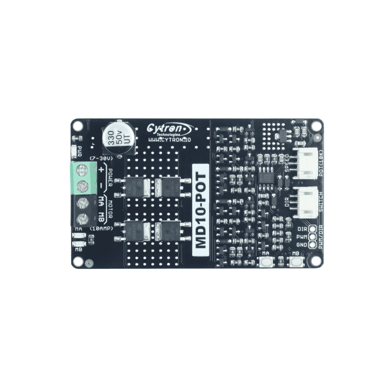 MD10-POT is a motor driver or speed controller that enables you to easily control a motor’s run/brake, direction and speed. No microcontroller is needed in a complete setup, hence programming is not required too. A DC brushed motor can be controlled directly using the Switch (Activation & Direction) and Potentiometer (Speed) included in the package.