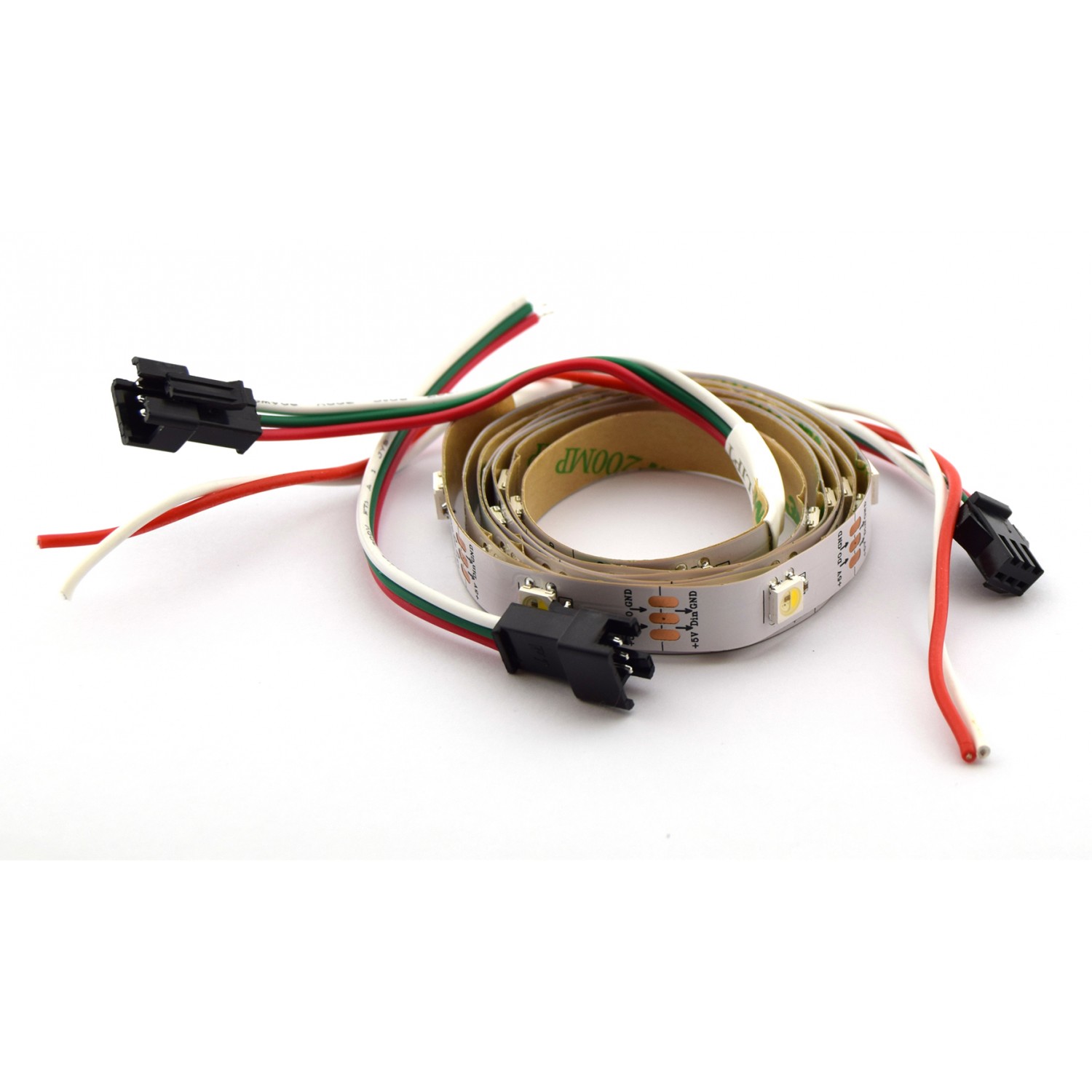 The strip comes in 1 meter with a 3-pin JST SM connector on each end and separated power/ground wires. These strips are sold in 1-meter length (30 LEDs).