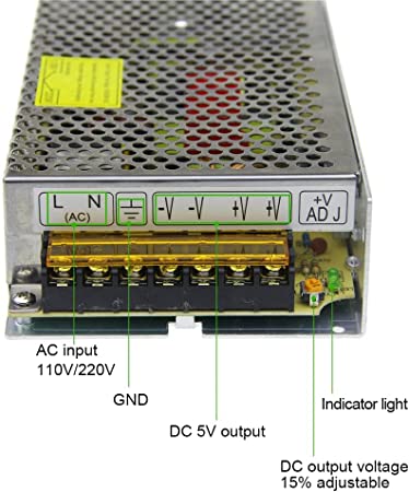 - Input: 110V/220V AC; Output: DC 5V 20A max. Output voltage can be adjusted 15%. Two sets of output Channel.