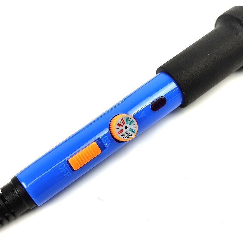 This soldering iron has an adjustable temperature range from 280ºC to 480ºC. For most lead-free soldering, try 350 – 400°C. For lead-based solder, 300 – 350°C will do. Adjust as necessary!