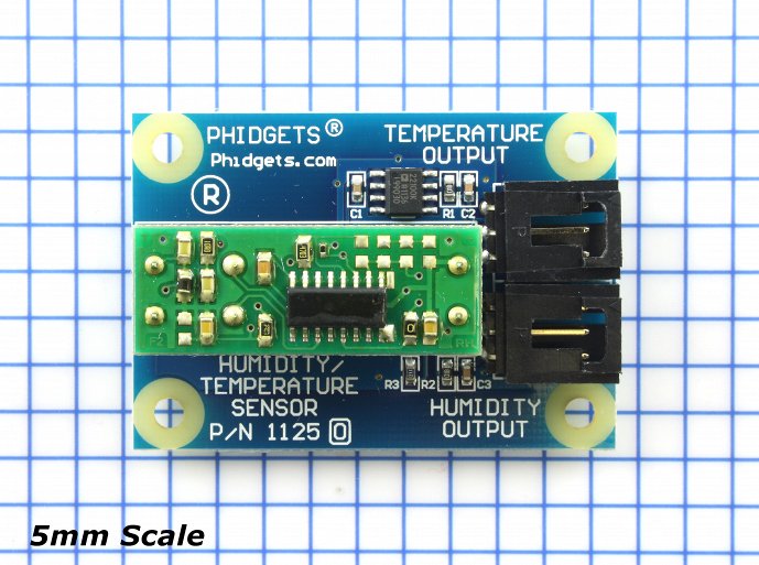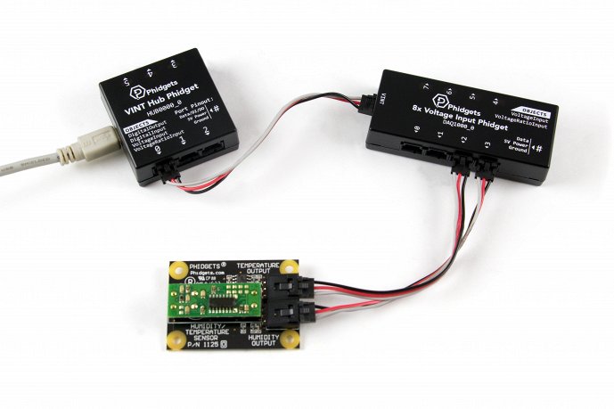 This board combines an ambient temperature sensor and a humidity sensor and connects to two Analog Inputs or VINT Hub ports.