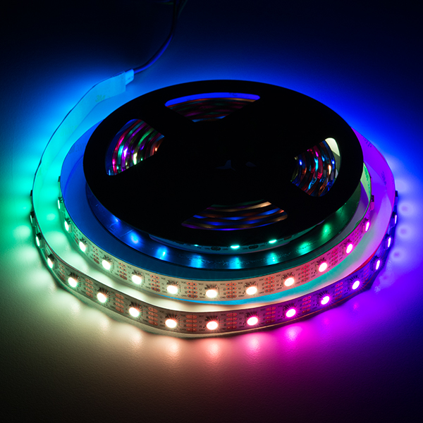These are addressable 5-meter-long 5V RGB LED strips that come packed with 300 APA102Cs. APA102 LEDs are very similar to WS2812s with a few caveats: APA102s can be controlled with a standard SPI interface, and they have an extremely high PWM frequency. There is access to each APA102 LED, and each strip length can be easily modified. You will be able to control each LED RGB individually, giving you the ability to create cool lighting effects for your car or perhaps under-cabinet lighting in your kitchen!