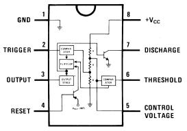 These devices are precision timing circuits capable of producing accurate time delays or oscillation. In the time-delay or mono-stable mode of operation, the timed interval is controlled by a single external resistor and capacitor network. In the a-stable mode of operation, the frequency and duty cycle can be controlled independently with two external resistors and a single external capacitor.