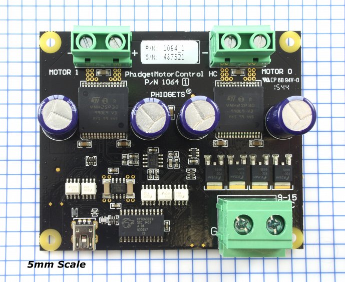 The PhidgetMotorControl HC allows you to control the angular velocity and acceleration of up to two high-current DC motors.