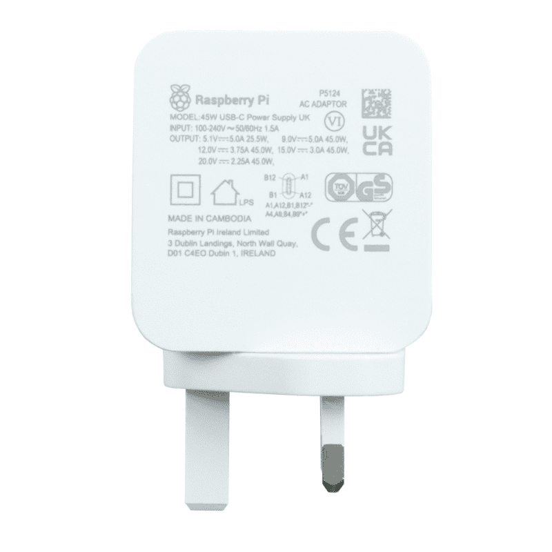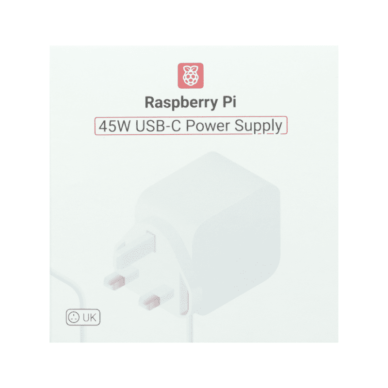 The Raspberry Pi 45W USB-C Power Supply expands the lineup of high-quality power supplies. Designed to complement both Raspberry Pi’s own products and third-party devices, it delivers reliable 45W power. This power supply comes with a UK plug