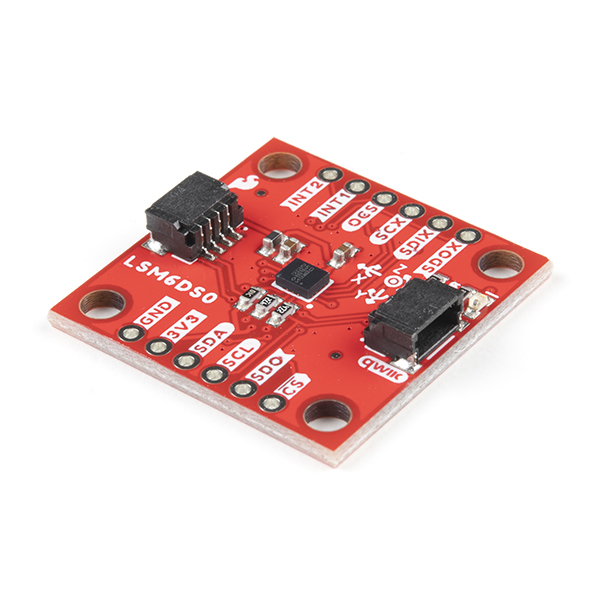 Utilizing our handy Qwiic system, no soldering is required to connect it to the rest of your system. However, we still have broken out 0.1″-spaced pins in case you prefer to use a breadboard. Each pin has been broken out on the LSM6DSO, with one side of the board featuring power, I2C, and SPI functionality while the other side sporting pins that control auxiliary functionality and interrupt outputs. Please keep in mind that the LSM6DSO is a 3.3V device so supplying voltages greater than ~3.6V can permanently damage the IC. A logic level shifter is required for any development platform operating at 5V.