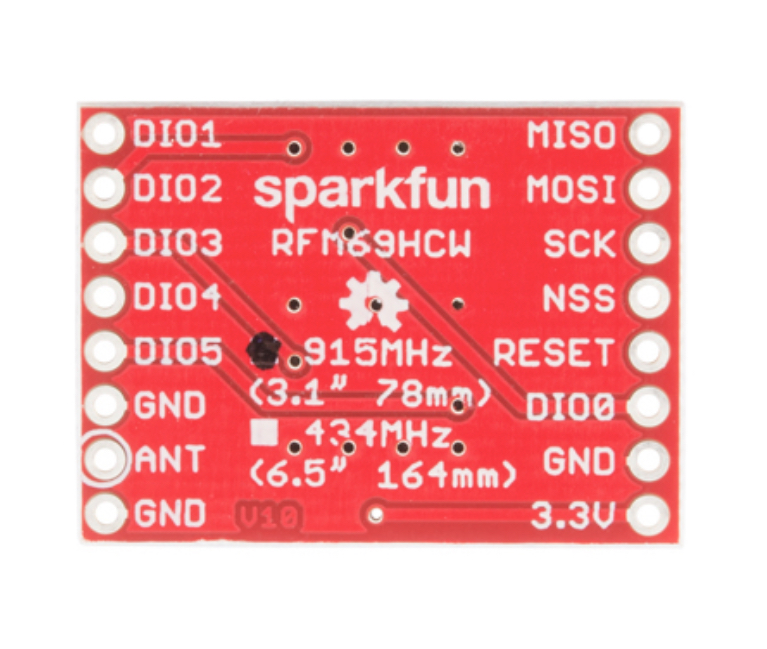This RFM69HCW operates on the 915MHz frequency and is capable of transmitting at up to 100mW and up to 300kbps, but you can change both of those values to fit your application. For example, you can maximize range by increasing the transmit power and reducing the data rate, or you can reduce both for short-range sensor networks that sip battery power. At full power and with simple wire antennas, the RFM69 breakout can get messages from one side of a large office building to the other through numerous internal walls. In open air you can reach 500 meters or more. With more complex antennas and modulation schemes, similar parts have successfully transmitted from space to the ground