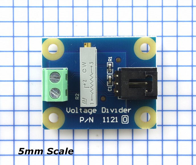The Voltage Divider eliminates the need to connect a resistor to an analog input by putting a high precision potentiometer on the board to allow the adjustment of the ‘fixed’ resistor.
